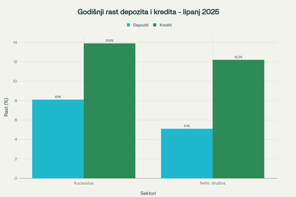 Dok štednja raste, krediti rastu još snažnije. Ukupni krediti domaćim sektorima na kraju lipnja 2025. iznosili su 48,5 mlrd. eura, što je porast od 9,1% na godišnjoj razini.