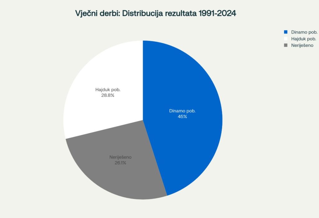 Distribucija rezultata vječnog derbija u HNL-u od 1991. do 2024. godine